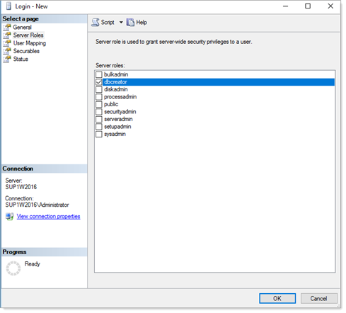 Use the following steps to grant the ObserveIT Service Account user the dbcreator role on the SQL server. This permission is required only during the installation phase and may be removed when the installation is complete. Removing this permission will prevent ObserveIT from creating additional archive databases with the service account and will require appropriate credentials when creating a new archive.