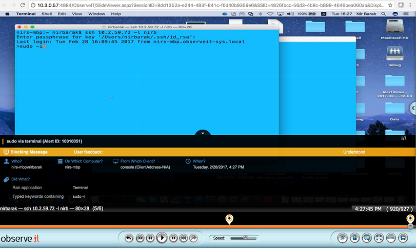 ObserveIT also enables you to generate alerts based on keylogger data which is captured on Mac-based desktops, laptops, or servers, as keyword-searchable logs.