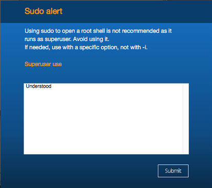 Depending on the Blocking Message configuration in the alert rule, the user can be required to acknowledge the message, and provide feedback explaining their actions (in the text box provided). They might also have an option to view the company policy (as in the above example, by clicking the Superuser use hyperlink). To close the message, the user must click Submit.