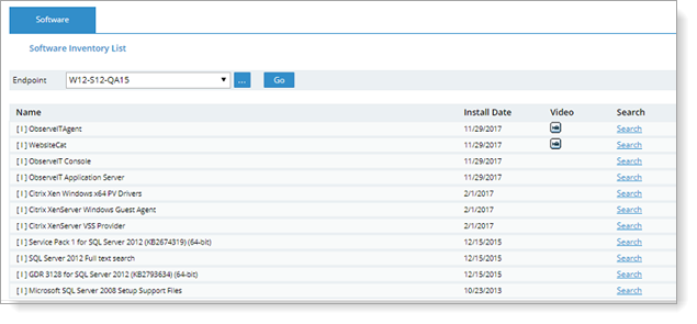 If a software or program is installed on the endpoint after the ObserveIT Agent was installed, a Video Replay icon will appear next to the software name, allowing you to replay and view that software's installation process. This link only appears for programs that were installed after the ObserveIT Agent was installed. Clicking the Search link next to a program or software opens a Google search page with results related to that program or software.