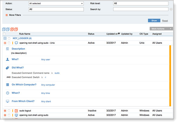 On Unix systems, you can generate alerts via key logging when users enter specific Unix commands or command line parameters (arguments). For example, you can alert on a user attempt to execute an action on sensitive file names, directory names, paths, and so on. For details, see Executed Command.