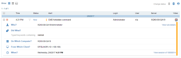 - To replay the session in which the user entered the blacklisted command, click the Video