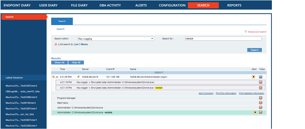 - In the Search tab of the Web Console, enter the keyword netstat in the Key Logging search option, and click Search.