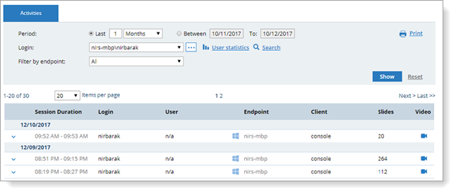 View session details, such as, date, duration, login or secondary user, endpoint, client, number of slides (or commands in the case of Unix sessions).