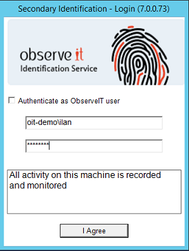 The following screen provides an example of the ITM On-Prem (ObserveIT) secondary authentication login screen that a Forced-Identification user receives after configuring a Windows machine for secondary authentication.