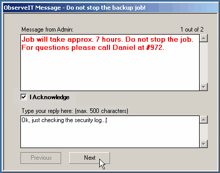 Users must acknowledge each message they receive. This information can be used to track user sessions and their interaction with the desktop. Furthermore, having proof that a user was indeed presented with the message, and that they acknowledged it, can be useful for auditing and security purposes. Without acknowledging the message(s), the messages window cannot be moved, minimized, or closed.