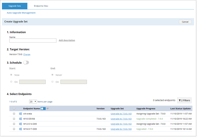 With Agent Auto Upgrade, you create Upgrade Sets that are composed of endpoints that you want to upgrade to the same version at the same time.
