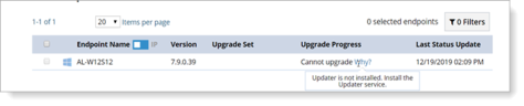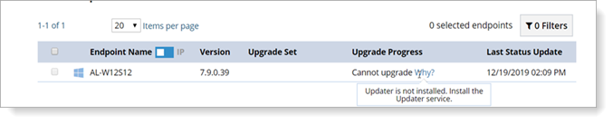 Ready for upgrade; Endpoint is ready, there is not Updater Cannot upgrade: Endpoint cannot be upgraded, click for Why to for a reason. For example, Updater is not installed. Upgraded: Endpoint upgraded successfully. |