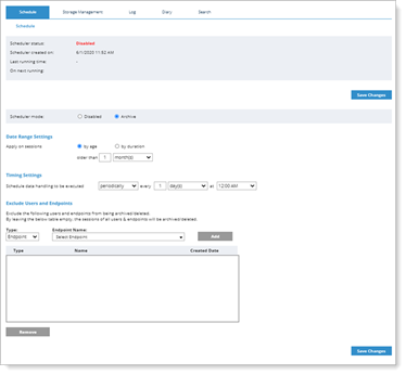 After specific sessions are archived, they will no longer occupy space in the production database/file system. These archived sessions will also no longer appear in the Endpoint or User Diary, or in the Search or Report results. The only way to replay the archived sessions will be to use the Diary tab of the Configuration > Archive page.