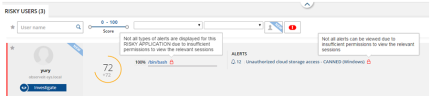 Users can view and access recorded data only for sessions on endpoints that they are permitted to view. This applies throughout the Web Console and in the User Risk Dashboard. If users attempt to access sessions to which they do not have permissions to view, a lock icon appears in the User Risk Dashboard with a tooltip explaining that there was at least one risky activity in a session that they do not have permissions to view. The following screenshot provides an example of this: