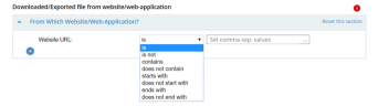 To specify the Website URL from which the downloaded file originated, select the relevant operator from the drop-down list and enter the URL.