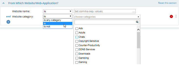 To specify the Website category from which the downloaded file originated, select the required operator and (unless you selected is any category) choose the relevant category(ies) from the drop-down list.
