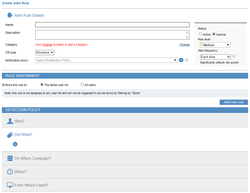 The core part of creating rules is defining the criteria (Who?, Did What?, On Which Computer?, When?, From Which Client?) that when met, will trigger an alert. A detection policy comprises the criteria that you configure for your rule. By specifying where, when, and by whom an activity is performed, you can define the scope of the activity and limit the number of generated alerts.
