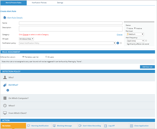 For each rule, you can specify a detection policy that defines the conditions that will trigger an alert, and specify additional actions to be taken when the alert is triggered. User warning notifications and blocking messages notify users in real-time about any out-of-policy behavior, enabling users to think again before performing a negligent or malicious action. Users can acknowledge a message, add a comment explaining their actions, and follow a link to view the company policy. If required, the security administrator can also select an action that will start recording a user when a security violation is detected.
