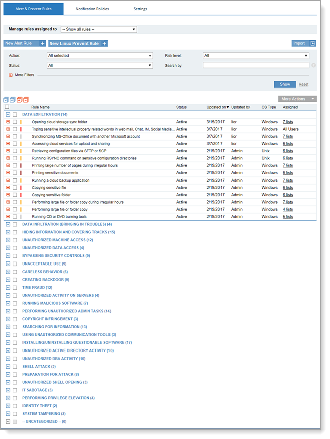 ITM On-Prem (ObserveIT) provides an extensive library of out-of-the-box detection scenarios that cover the most common scenarios of risky user activities that might generate alerts. These rules have built-in policy notifications that are designed to increase the security awareness of users, and reduce overall company risk. ObserveIT’s Library of alert rules can be applied on Windows and Unix/Linux machines. They are grouped according to security Categories to help navigation and management. Each alert rule in the ITM On-Prem (ObserveIT) Insider Threat Library is associated with one Category. A rule that does not necessarily fit into one of the predefined categories can be associated with a built-in category named UNCATEGORIZED. For details, please refer to the Alert Rule Categories.