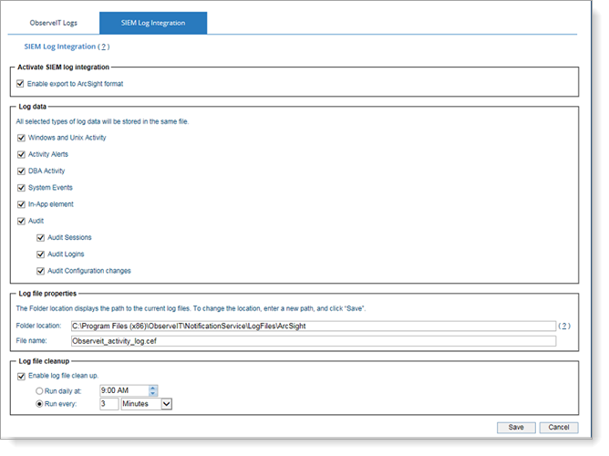 All selected log type data will be stored in one file; by default, Observeit_activity_log.cef.
