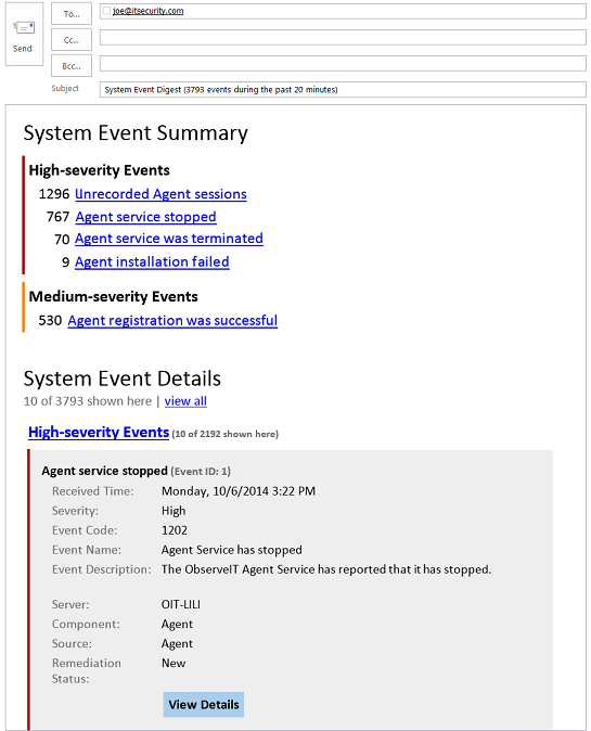 The following is a sample email notification that users might receive when a system event is triggered.
