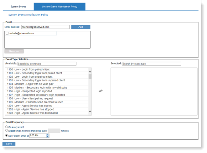 Administrators can assign a notification policy to each system event to designate who gets notified by email, for which event types, and at what frequency. The system events notification policy determines whether the recipients receive immediate notification with separate emails upon each event, digest emails of event activity per specified number of minutes, or digest emails on a daily basis at a fixed time. For example, IT security officers in charge of handling high-severity system events can be notified immediately upon every event with a separate email for each system event notification. Events of lower severity or priority can be sent to relevant personnel in digest emails at predetermined intervals. Other individuals, such as compliance officers or managers, may require only a daily summary of the day’s system events.