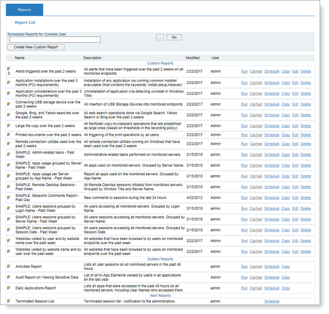 ITM On-Prem (ObserveIT) provides preconfigured built-in reports (System Reports) that you can use directly in your organization, or customize to suit your own requirements (Custom Reports). System Reports can be run immediately, scheduled to be run at specific intervals, and copied; they cannot be edited or deleted. Custom Reports can be run, scheduled, copied, edited, and deleted. New custom reports can be manually created from these reports. Sample (custom) reports can be edited and customized to suit your own requirements.