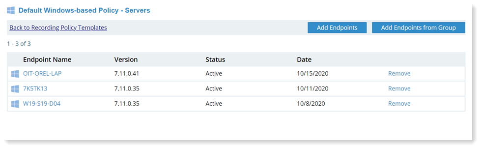 You can configure policy settings manually per endpoint (Agent) from the Configuration > Endpoint Management > Endpoints page, or by using Recording Policy templates to configure many endpoints (Agents) simultaneously.