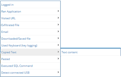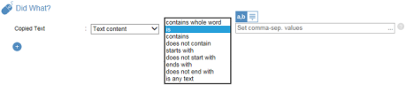This topic describes how to define alert rule conditions using the options available in the Copied Text group category in the Did what? section of the Create Alert Rule page. (For more about the Did what? section, see Defining the "Did What?" Conditions.)