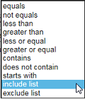 From the list of available operators, select include list which allows you to display report data for each value that you enter in the text field. (If you select exclude list, data will be displayed for any value which is not included in the list.)