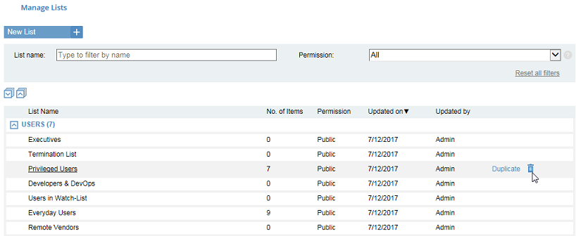 If the List is currently being used by at least one alert rule, you will receive a message displaying the names of the rule(s) that are being used, and you will be unable to delete the List.