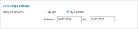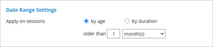 by age: Delete data that is older than a specified number of Days, Weeks, or Months. All sessions older than this will be delete . Note that you cannot select a time range that is less than three days from the current time on the database. The default date range is older than 1 month.