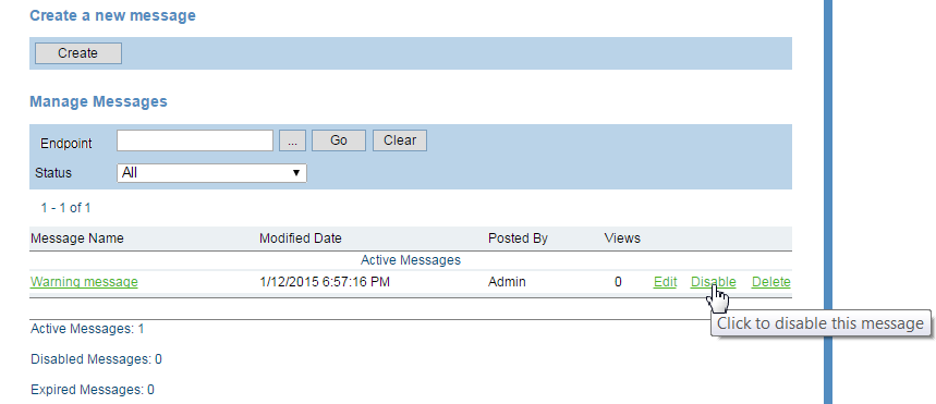 After a message is created, it can be easily disabled. Disabling a message allows you to temporarily prevent it from being displayed. Disabled messages can be re-enabled.