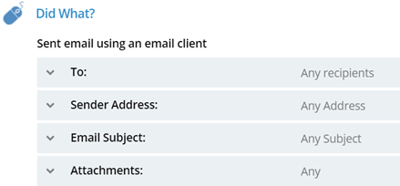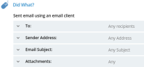 You can define an alert to trigger when an email is sent from an email client. You can specify recipient, sender, subject, and/or attachment details about the email.