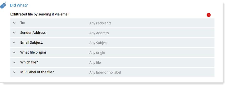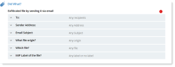You can define alert to trigger when an attached file is sent via email. You can specify recipient, sender, subject details about the email. You can also specify details about the file and its origins.