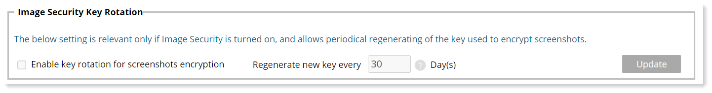 The setting is relevant only if Image Security is turned on, and allows periodical regenerating of the key used to encrypt screenshots. (See Securing Images on the File System .)