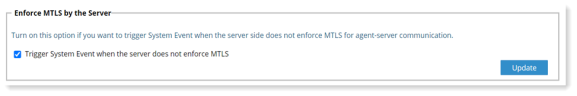 Use this option to validate mTLS communication. A system event is sent when the server-side does not enforce mTLS indicating that you need to configure the server-side for mTLS. The system event is triggered no more than one time per calendar week and only once per issue. It is not triggered again until the issue is fixed and then only if there is a new issue. A separate system event is sent when the issue is fixed.