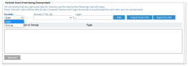 In the Exclude drop-down list, select Group, select the domain for the group from the Domain drop-down list, and type the Group Name. Click the Add button.