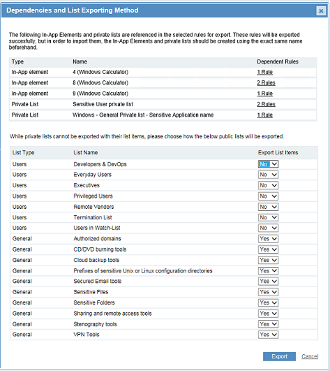 To protect privacy, Private lists cannot be exported with their Items. The lower part of the window displays the names of all the Public lists of Users and General types that were selected for export. For each List, you can select Yes or No to choose whether or not to include the List's Items in the exported file. The default for Users lists is No, the default for General lists is Yes.