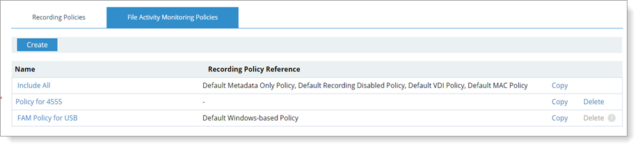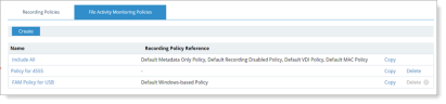 To view the list of available policies, select Configuration > Endpoint Management > Recording Policies and select the File Activity Monitoring Policies tab.