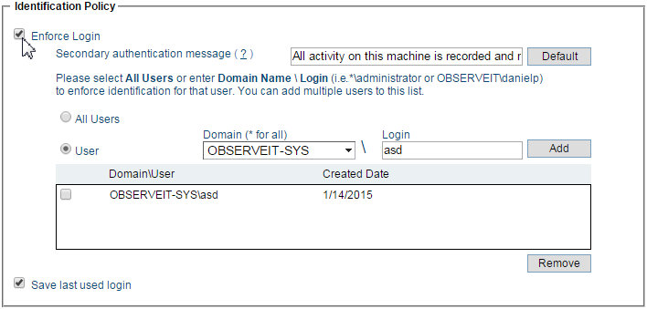 Select the Save last used login check box if you want to auto-populate the User Name box of the secondary ITM On-Prem (ObserveIT) logon screen with the last logged-on user name.