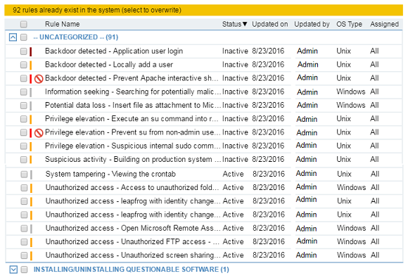 If you want to import System Rules that were exported from the ITM On-Prem (ObserveIT) Insider Threat Library (ITL) by ObserveIT, you can easily identify the ZIP file by the "ITL version number" prefix before the date and time; for example: "ITL 6.8.0.3 - 2016-11-06--09-05.zip". For details about the preview screen that opens when importing System Rules, see Importing System Rules from the Insider Threat Library.
