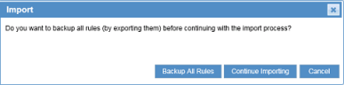 A dialog box opens, asking if you want to back up all the rules in the system before continuing with the import process.