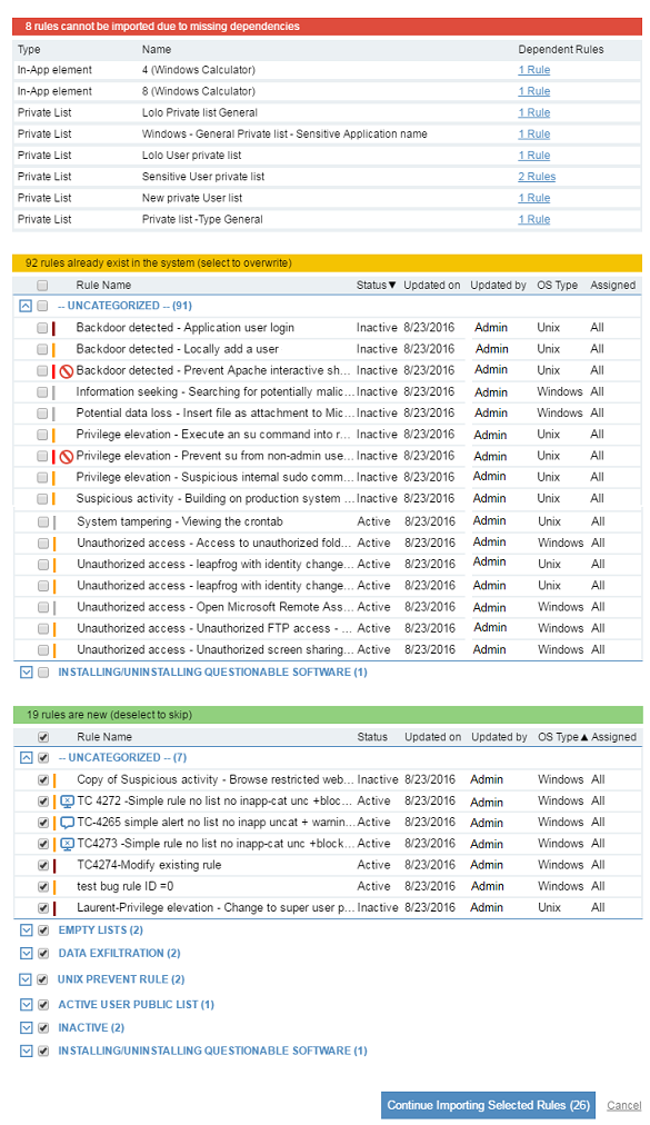 When you have finished previewing or making changes to the rules' selection, click the Continue Importing Selected Rules <num> button.