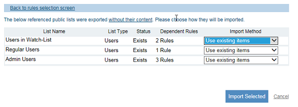 If some of the Lists were exported without content (Items), you can choose to import them using existing Items or not import their related rules (as shown in the following example):