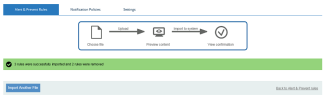Upon successful completion of the file import process, a confirmation message is displayed showing the number of rules that were successfully imported and the number that were removed (if relevant), as shown in the following example: