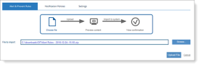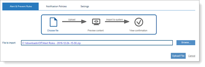 Click the Browse... button to locate the ZIP file containing the exported rules that you want to import (identified by date and time), and click the Upload File button.