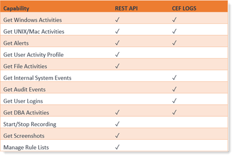To decide which method you want to use to build your integration, you can review the capabilities chart below. See if the RESTful API or CEF logs best meets your needs.