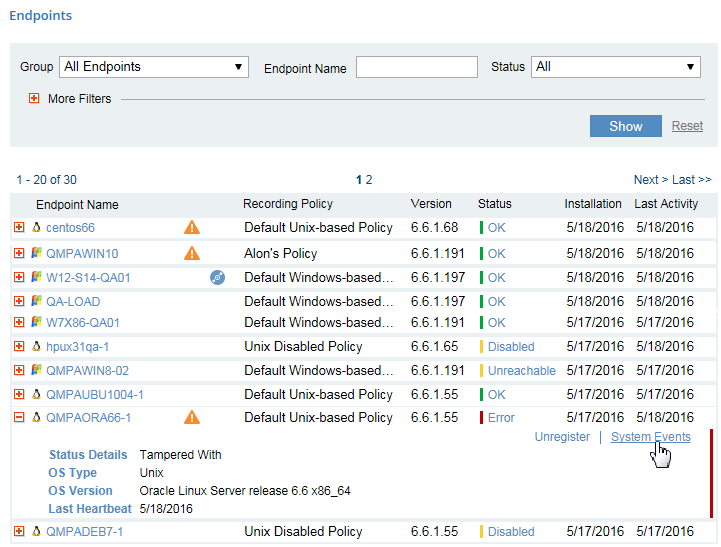 In the Endpoints list, in the expanded details of an Agent with an Error status, click the System Events link (or the Status link).
