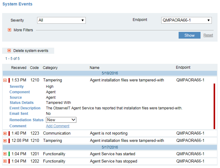 icon will be displayed alongside the Agent in the Servers list. Clicking the icon will open the System Events list filtered to display the last week's "tampered with" or "data loss" events related to this Agent. For more information, see Drilling Down to Agent Details.