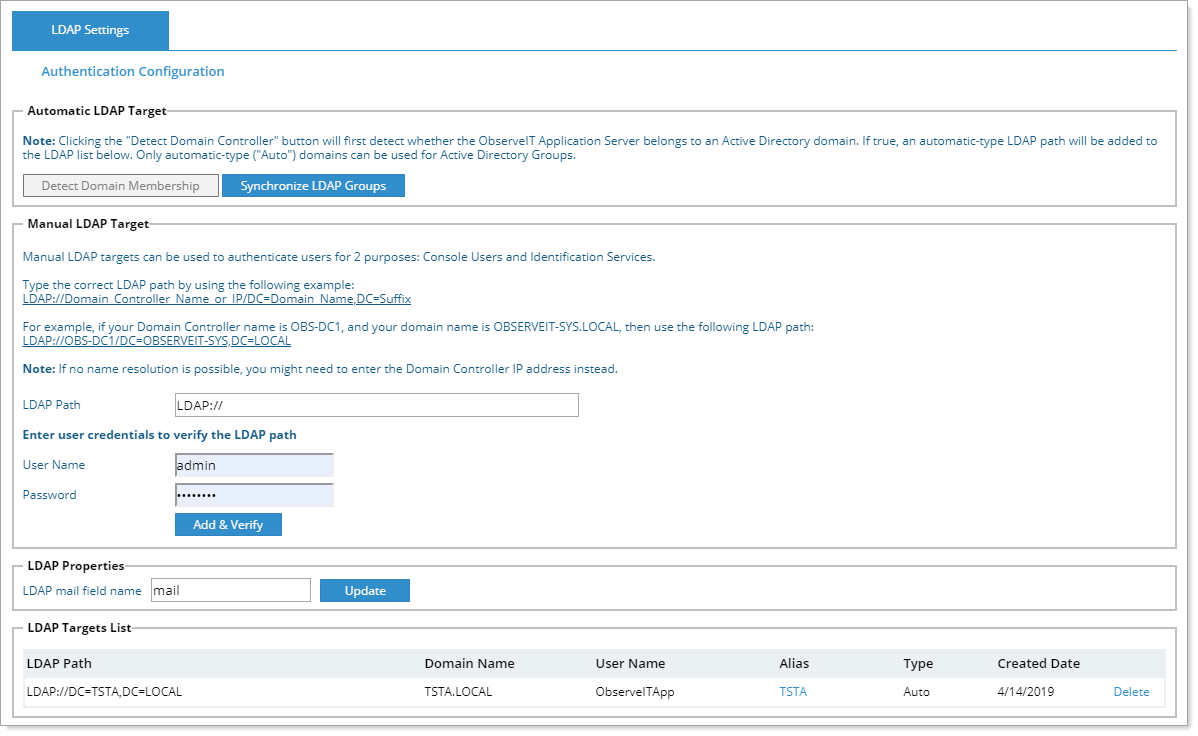 From the Configuration > User Management > LDAP Settings page of the Web Console, you can configure automatic and manual LDAP targets, and change the default LDAP email field name, if required.
