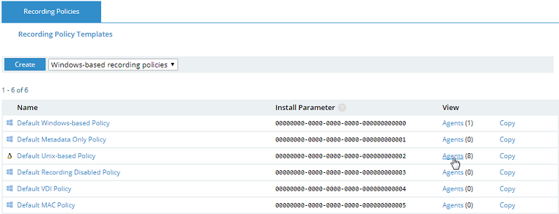 In the Recording Policy Templates list (Configuration > Endpoint Management > Recording Policies), click the Agents link next to the Recording Policy that you want to link to.