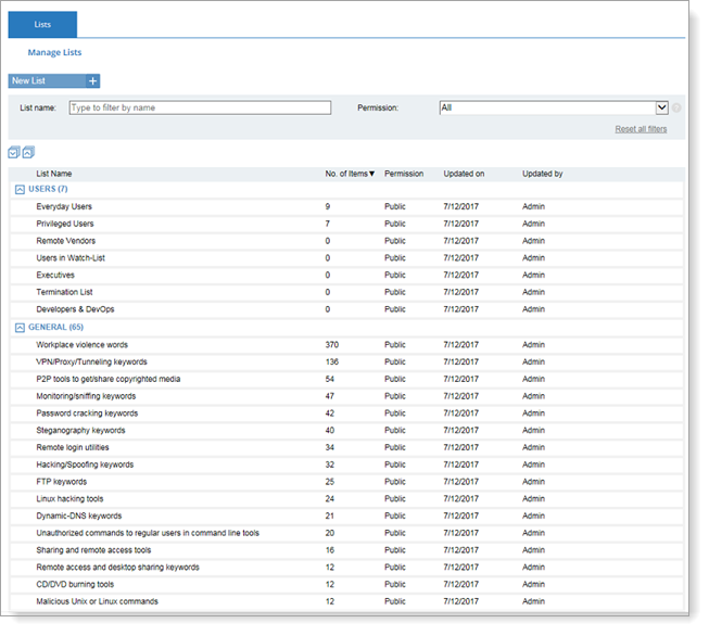 Permission: Public or Private. Note that lists configured in the ITM On-Prem (ObserveIT) Insider Threat Library have Public permissions.