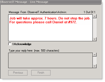 Users must acknowledge the message(s) they receive. This acknowledgment is recorded in the ITM On-Prem (ObserveIT) console, and can be used as proof that the user(s) have indeed been warned about a specific task, and that they understood and accepted the message.